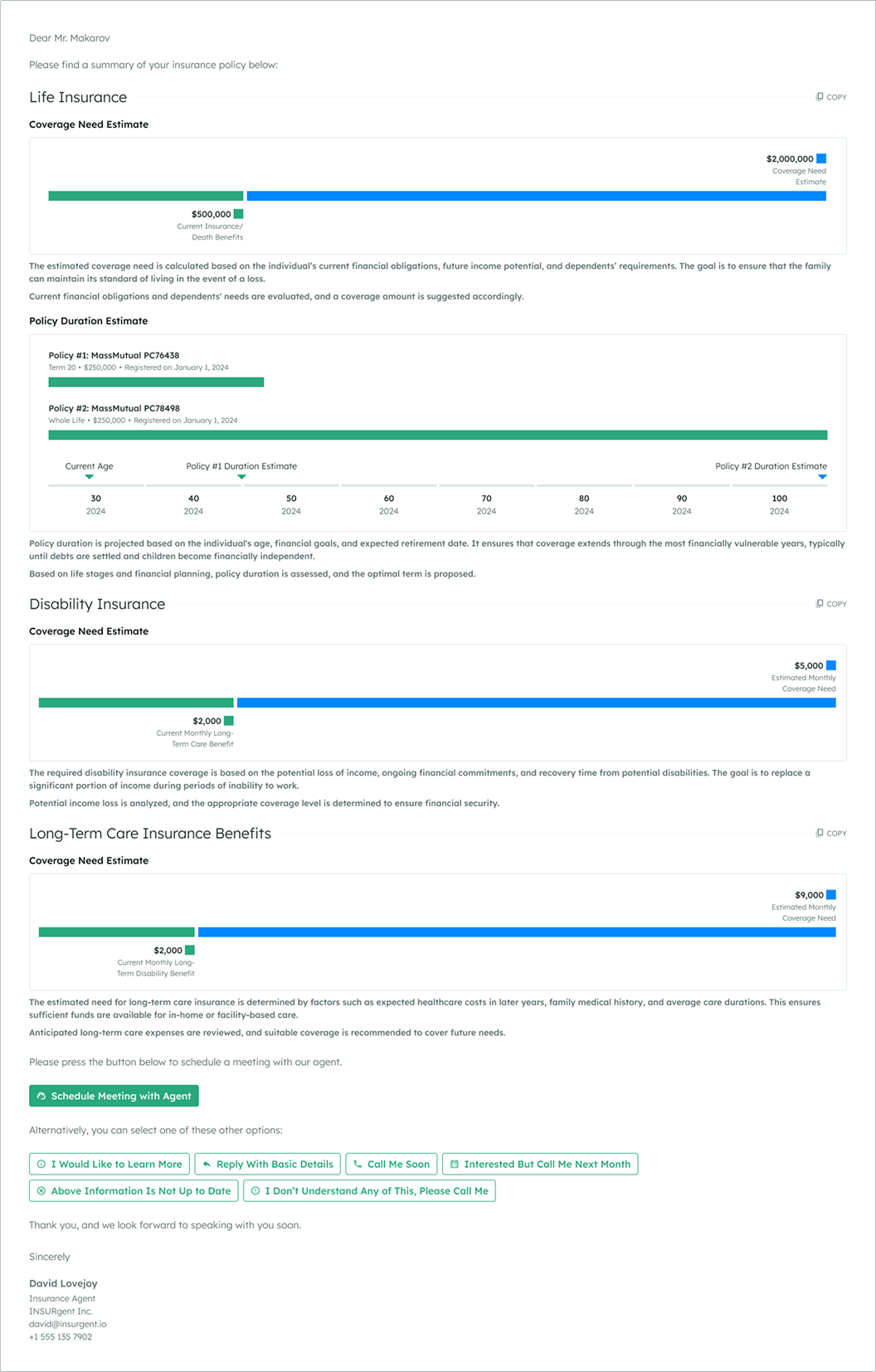 We equip agents with personalized communication tools, timely reminders, and clear analysis—making it easier for clients to understand their coverage needs and take action.